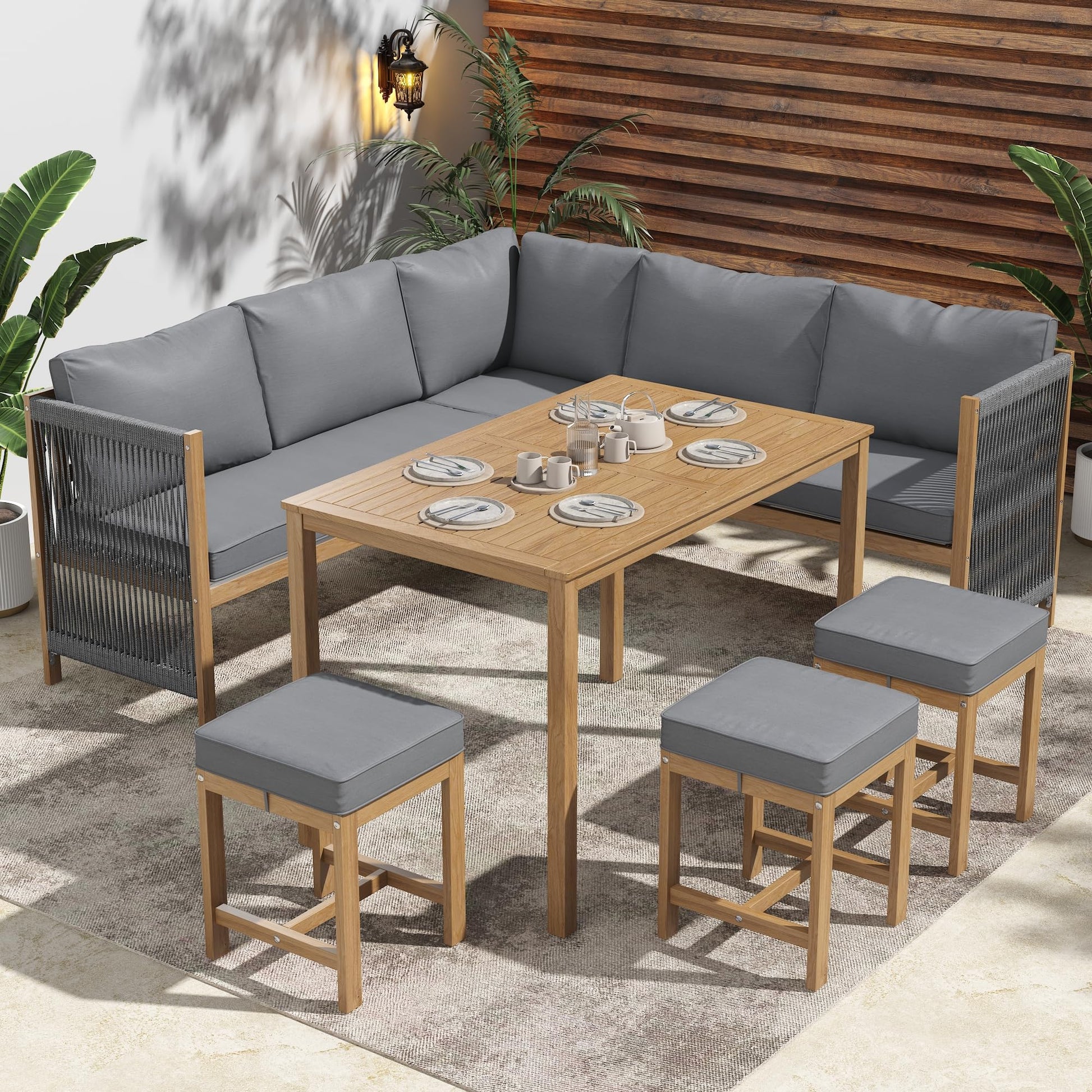 Gartenmöbel Set,Esssets,Event-Sofa-Esstisch- und Hocker-Set mit bequemen Kissen, Terrassenmöbel, Outdoor-Tisch- und Stuhl-Set für 7–8 Personen, Outdoor, Tisch und Stühle,Akazie