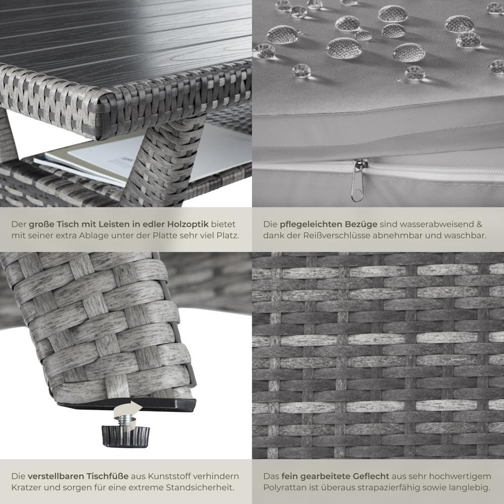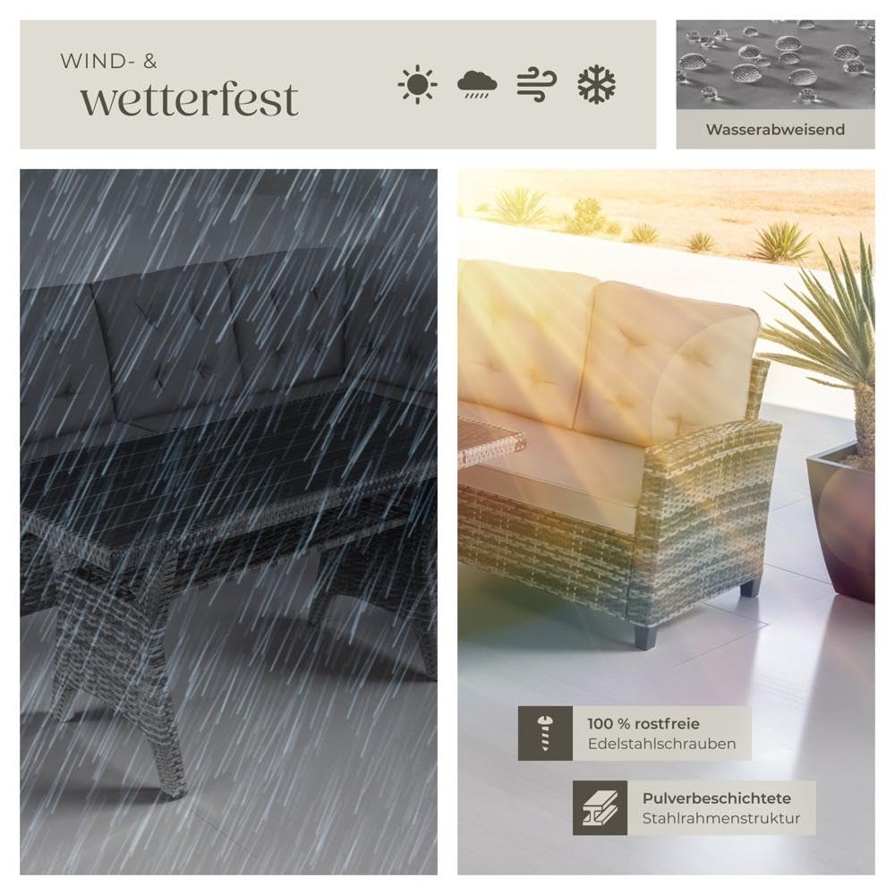 • STILVOLL UND PFLEGELEICHT FÜR JEDEN OUTDOOR-BEREICH: Mit ihren abnehmbaren und waschbaren Sitzbezügen ist dieses Garten Loungemöbel Set nicht nur stilvoll, sondern auch äußerst praktisch. Ideal für jeden, der eine pflegeleichte, wetterfeste und gleichzeitig elegante Lösung für Garten, Balkon oder Terrasse sucht. Genieße stilvolles Design und unkomplizierte Handhabung, die diesen Esstisch mit Bank zu einem unverzichtbaren Bestandteil Deiner Outdoor-Einrichtung macht.